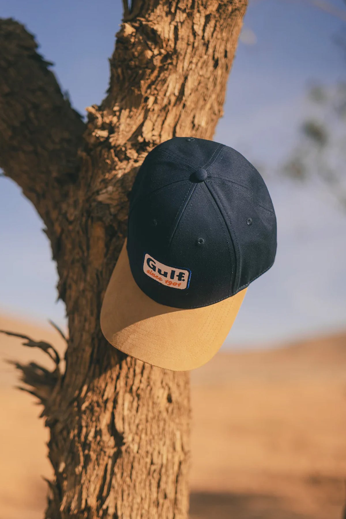 La casquette Gulf combine look rétro et esprit racing avec sa finition en velours côtelé bleu marine et sa visière camel effet suédé. Elle arbore fièrement un badge brodé "Gulf since 1901" à l’avant, soulignant l’héritage centenaire de la marque.