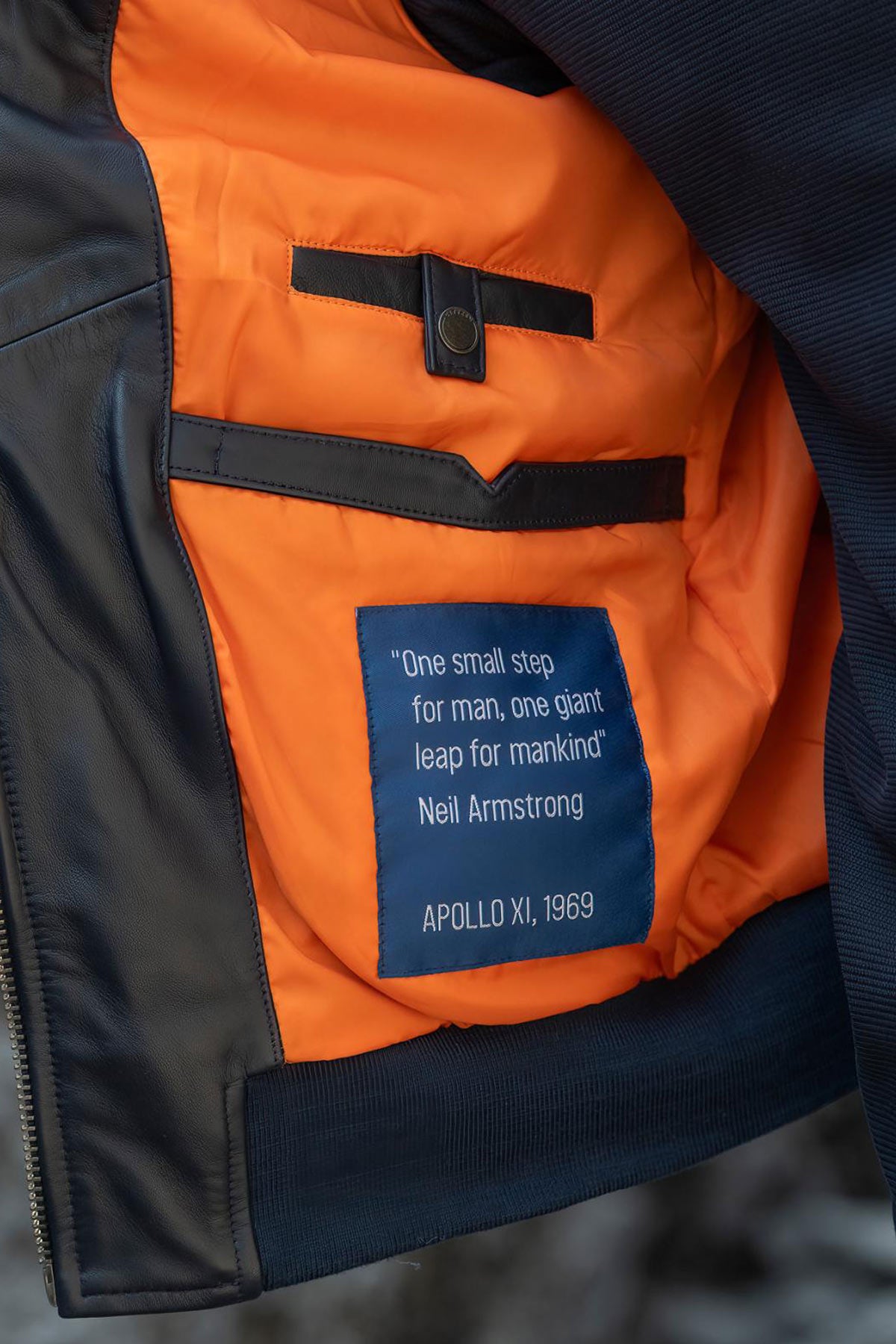 Magnifique Blouson en cuir de mouton, édition hommage à la mission Apollo XI de la NASA. Ce modèle mixe élégance urbaine et esprit conquête spatiale pour un style résolument audacieux.