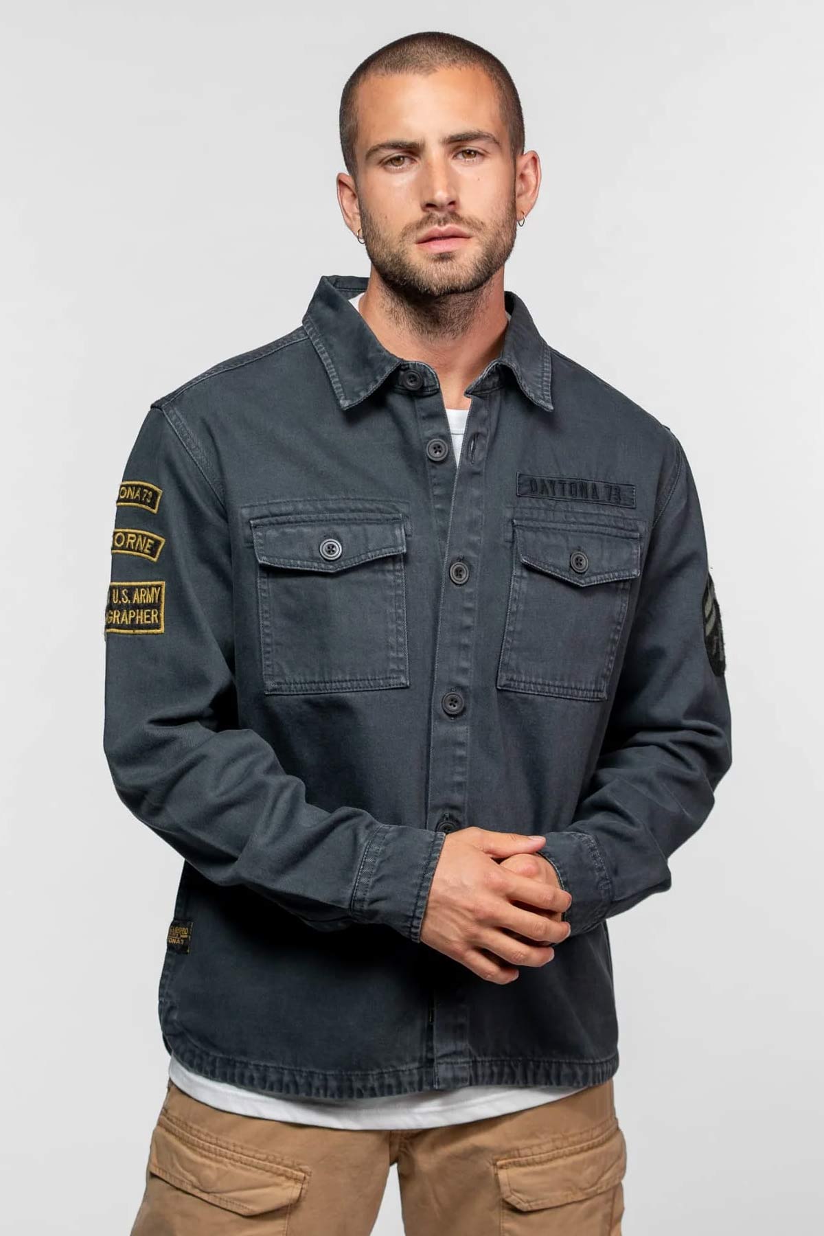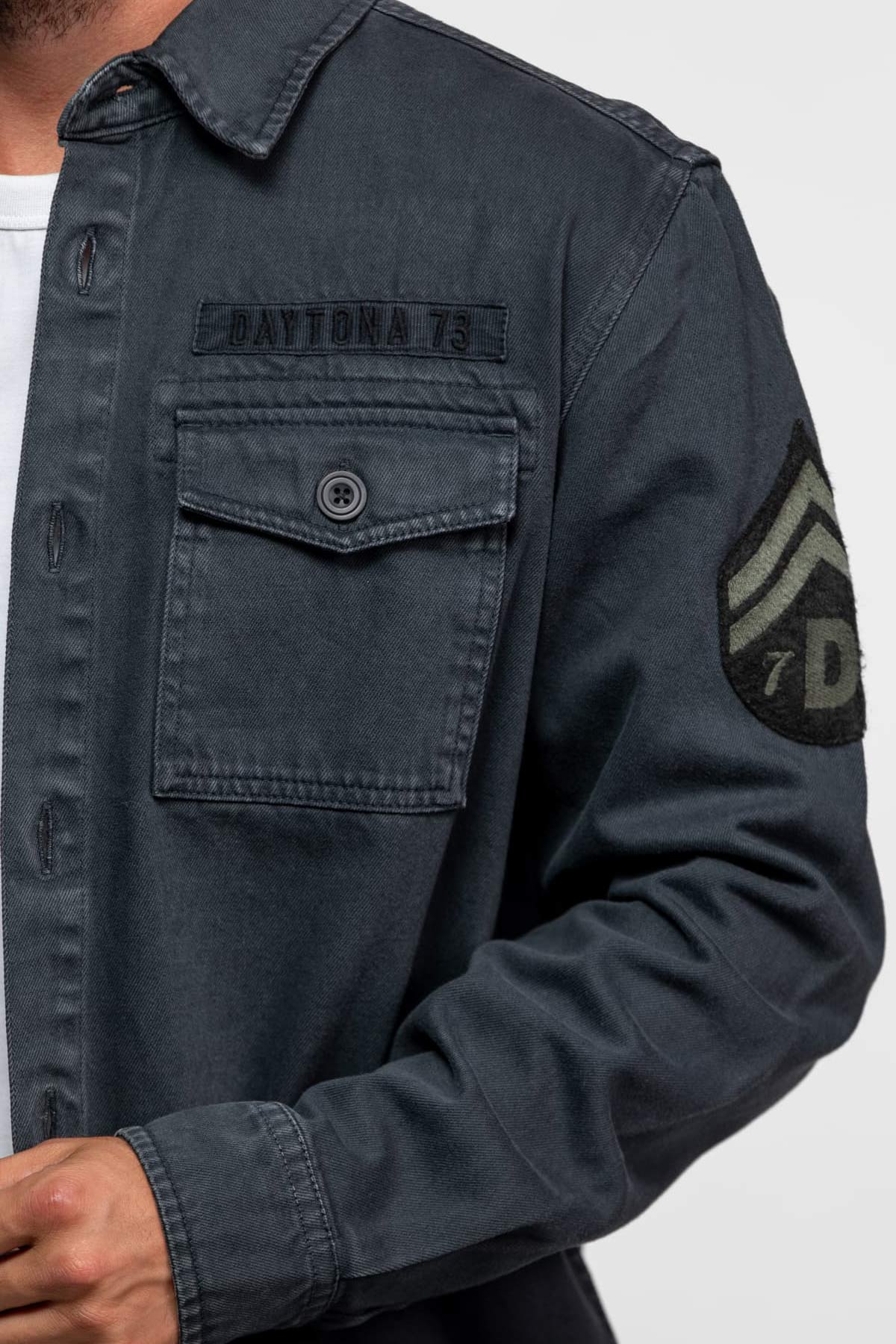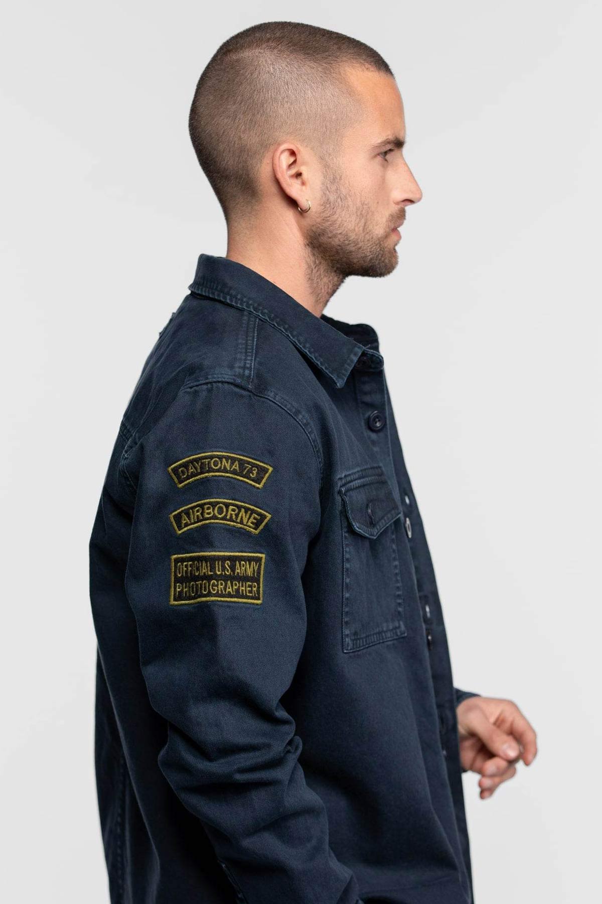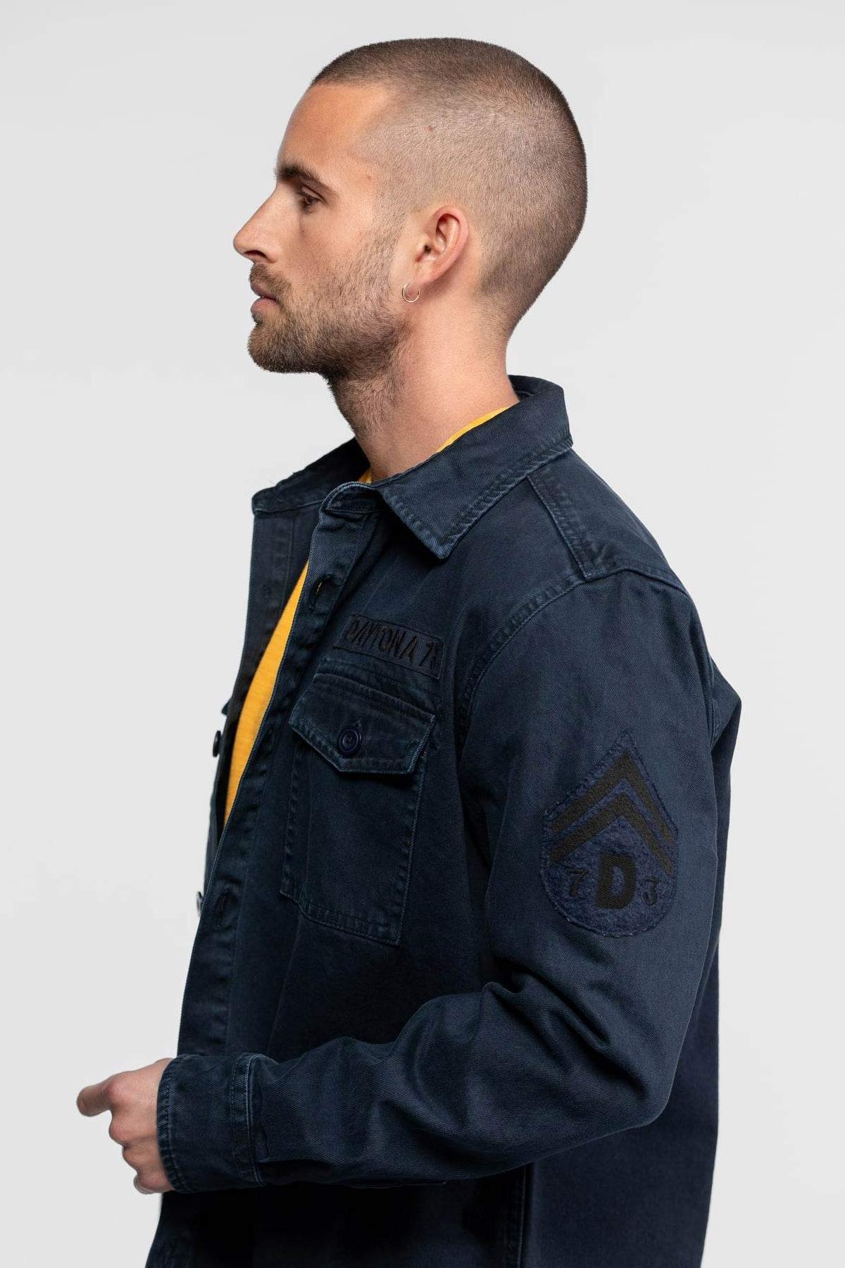 Cette surchemise au style militaire de la marque Daytona, a été fabriqué dans un coton bull denim épais et robuste. Son tissu a été teinté dans la masse pour être ensuite délavé, ce qui lui donne cet aspect vintage et usé. Cette pièce s'est imposé rapidement comme un iconique de la marque.